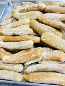 画像は12月の頭に仕込みを始めたカラスミが少し前に仕上がった際のものと、旬の北海道産タラバ蟹を活けで取り寄せて茹でたものになります。