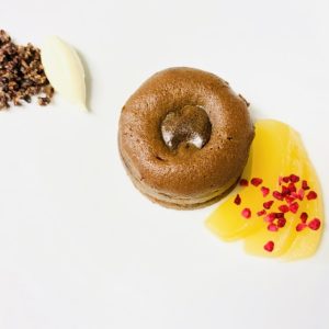 付け合わせにはサワークリームとカカオニブのクランブル、フルーツのコンポートを添えてありますので、芳醇なショコラの甘味と香りを対照的な付け合わせとお楽しみいただければと思います。