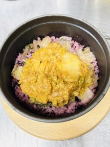 なので、その苦味を和らげ天然ならではの蕗の薹の旨味を感じてもらえるようにできたのが蕗の薹と豚バラ肉、トマトと発酵白菜を使った本年度版の蕗の薹の炊き込みご飯になります。