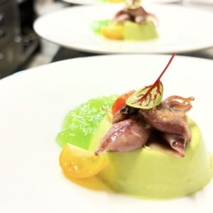 グリーンアスパラの旨味と香りを感じていただけるようにブランマンジェとグリーンアスパラのコンソメのジュレを仕込み、そこに合わせるのはこちらも旬の富山のホタルイカのマリネをした物をトッピングしました。